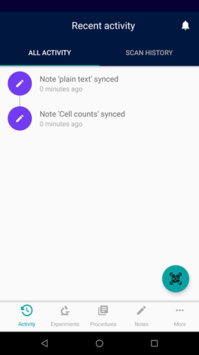 In the Activity tab is a list of the most recent activities in the Mobile App. For example the last uploaded images or edited notes. To view the last made scans go to Scan History.