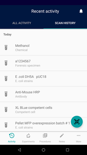 The Scan History shows a list of last scanned samples, devices and compartments. Press one off these items to view the item information.