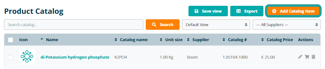 To add a new item to the Product Catalog, navigate to the Product Catalog page under the Supplies tab and click the Add Catalog Item button.