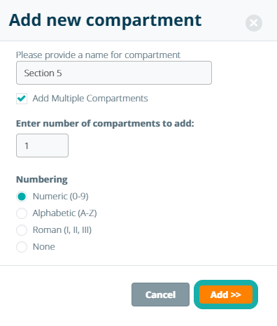 The compartment name field will provide a default name based on the storage unit's configuration settings, which can be edited according to the user's preferences. Mark the option Add multiple compartments to create compartments in bulk from the selected compartment type template.. When adding multiple compartments, users can define the following settings: