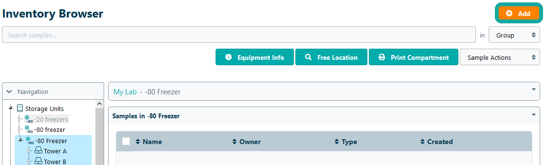 To complete the configuration of a new storage location, or to add compartments to an existing storage location, navigate to the Inventory Browser and select a storage unit or compartment in the navigation tree. Click the Add button and select the template you want to use to create your new compartment. Note: in order to create a compartment, users must first create a compartment type template. If a default compartment type was defined as part of a storage unit's configuration, then this template will be listed as an available option after the unit has been created.