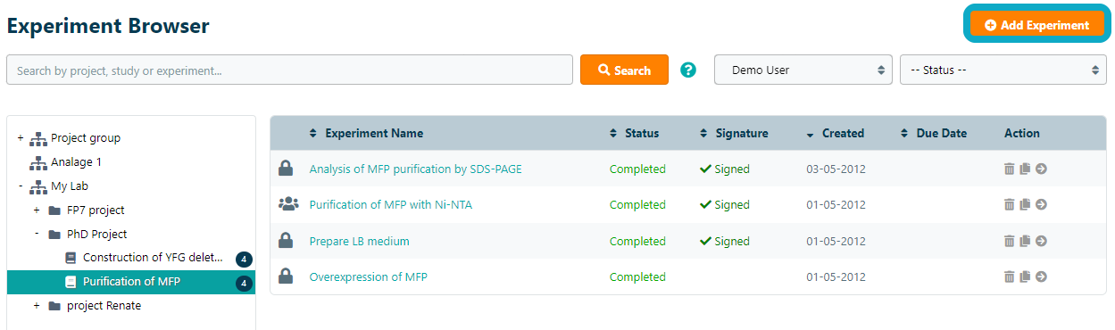 To log a new experiment in the digital lab notebook, navigate to the Experiment Browser and click Add Experiment. Note that you must first define a Project and a Study in order to add an experiment to the ELN.