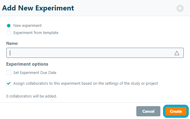 If you have set up Experiment Templates, you can select the Experiment from template option and choose the desired template from the dropdown field; otherwise, you can start with a blank page in your ELN. Select the project and study where the experiment will be stored and click Create.