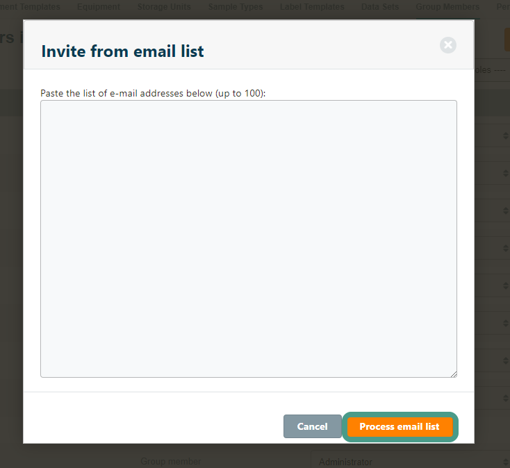 You can provide up to 100 email addresses at once. After pasting the email address list, click Process email list to send the invitations.