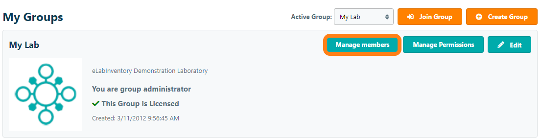 To add a user to your lab, you can send an invitation to your colleague. Navigate to Groups and click Manage Members. Alternatively, you can also manage group members by navigating to Group Members in the Configuration menu.