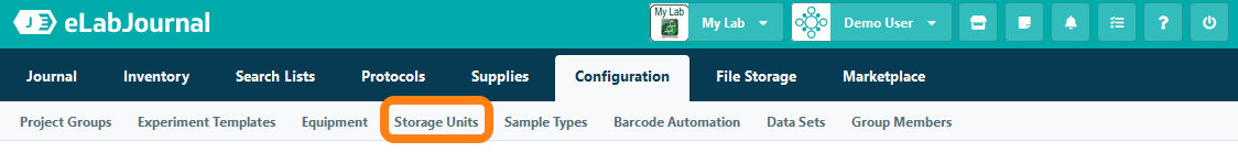 To add a storage unit to your lab, navigate to Storage Units under the Configuration tab and click the Add Storage Unit button.
