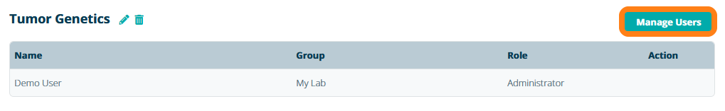 After creating a project group, you can define which users can access the project group by adding group members. Navigate to Project Groups in the Configuration tab and click Manage Users. Note: the option to manage users in the project group is only available to the project group administrator and require permission to edit project groups.