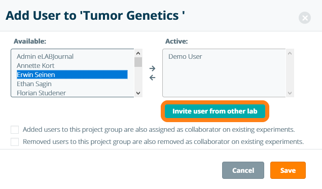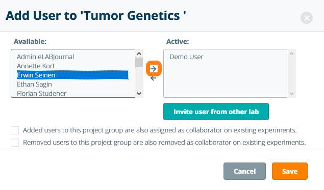 In the pop-up window, select a member of your lab, move them to the right-hand-side panel using the arrow, and click Save. When adding a user to a project group, the user can automatically be assigned as a collaborator to all existing experiments in the project group by marking the checkbox: Added users to this project group are also assigned as collaborators on existing experiments. Users that create or edit a project are automatically added as a collaborator when this setting is used. Note: merely adding a user to a project group does not automatically ensure that all added project group members will be added as collaborators within an experiment in this project group. In case you want that all project group members to be added to every experiment created in the project group, please make sure to change the project collaboration setting accordingly for each project in the project group.