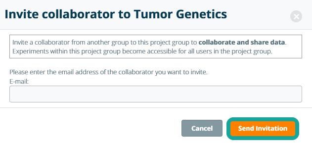 Enter the email address of the collaborator and click Send Invitation. The invitee will receive an email with a link to accept the invitation. If the collaborator whom you have invited is not a registered user in eLabJournal, they will first need to set up an account. Note: users will have the same rights in the project group as in their own lab except for the administrator.