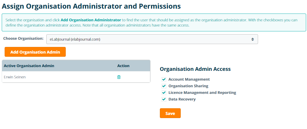 To be able to delegate system maintenance tasks to other users in the system, such as user management, license reporting, organisation sharing and data recovery, without providing them full system control, eLabJournal offers the option to assign an Organisation Administrator.