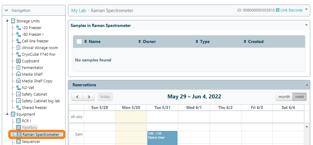 When the planner option for a device is active, you can see when devices are available and when a device can be reserved for an experiment. Browse to Inventory – Inventory Browser, open the equipment in the inventory tree and select the device that you want to book. In the planner, you can see all reservations and be able to add bookings by clicking in the planner at the start time. Drag and drop to select the reservation end time.