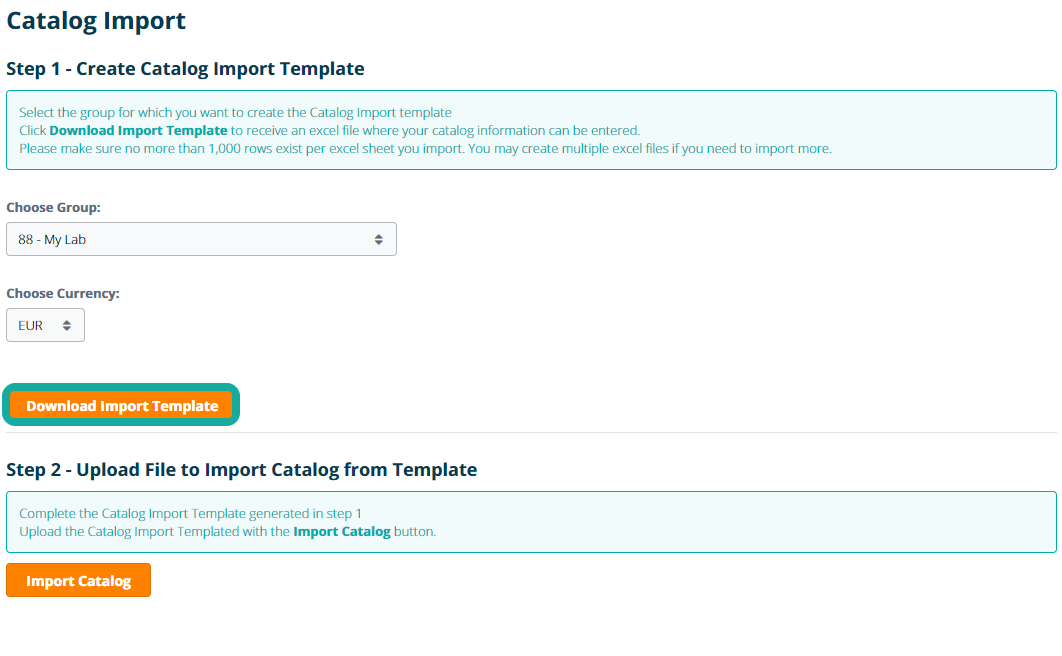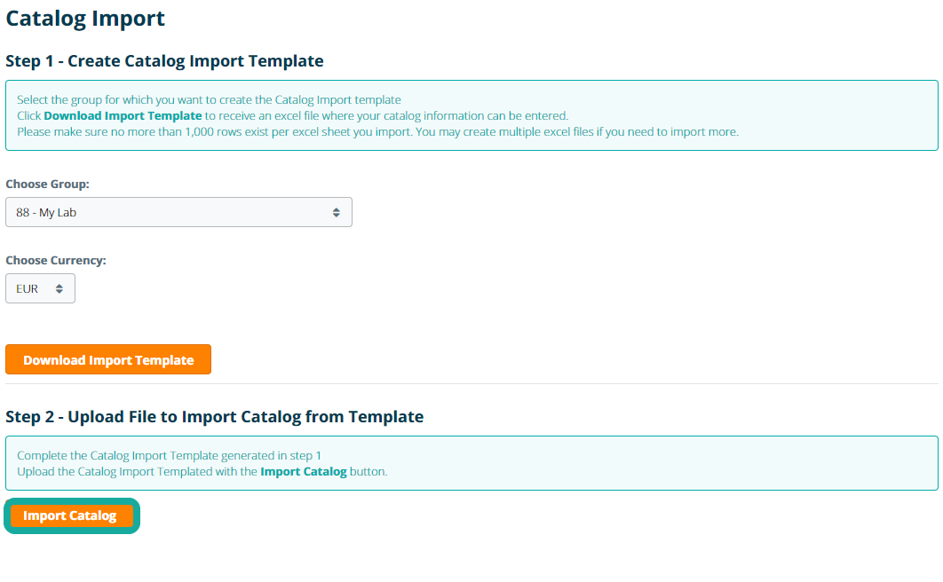 To Import the Product Catalog, Click Import Catalog in step 2 and select the completed Import Template. After selecting the file, confirm that the correct group in which the products in the catalog should be imported is selected, and click Import.