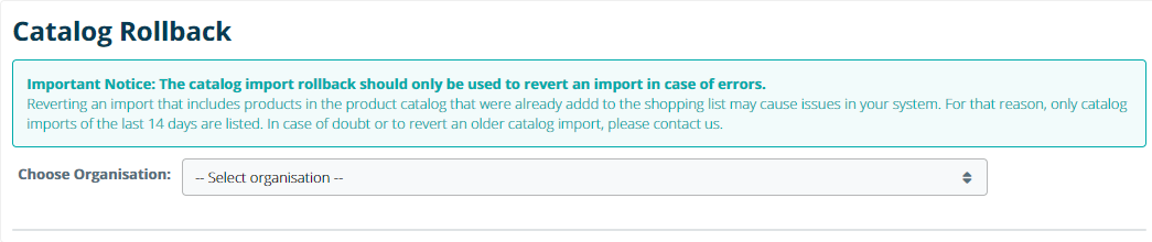 All products are imported in the eLabJournal Product Catalog of the corresponding group and can now be used. Make sure to check if the import has been executed correctly. In case of errors in the import, you can use the Catalog Import Rollback option that allows you to rollback any import done in the last 7 days. Select your organisation and the group in which the import has been executed and click Rollback to revert the import.