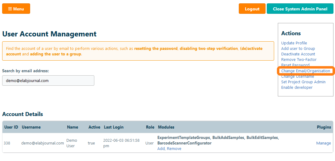 In the appeared window, you can change the email address and click Save. Note that the email address can only be changed to an email address with a domain that is registered in the system and is associated with your license. In case your organisation use the login of eLabJournal and not Single Sign-On (SAML/AD/LDAP), we recommend to also update the user name to avoid confusion for end-users with their login.