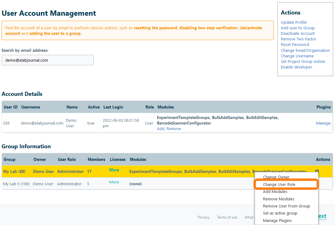 To change the user role in a group, navigate to the System Admin Panel panel and open Manage Accounts. Find the user by email address. Open the actions menu of the Group Information and click the Change User Role option in the actions menu.