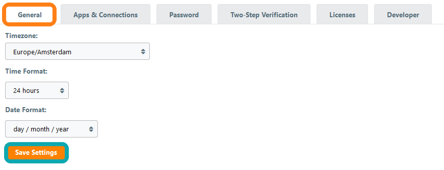 Under the General tab, you may change the time zone setting for your account. Select the desired time zone from the dropdown list and click Save Setting to confirm.