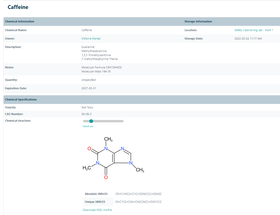 Once the sample has been saved, the entire chemical structure will be visible on the sample data sheet, along with its Absolute and Unique SMILES codes. Additionally, ChemAssist will generate an MDL molfile of the structure, which can be downloaded by clicking on the “Download MDL molfile” link.