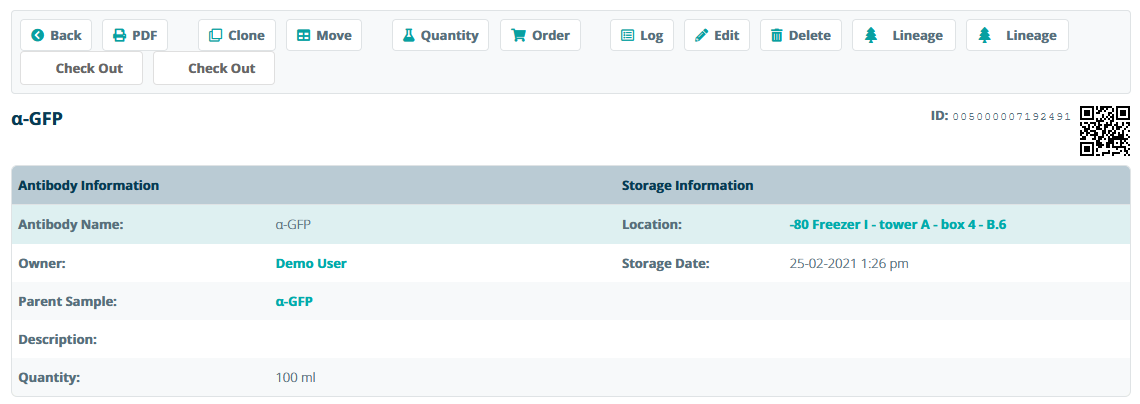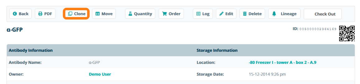 To duplicate tubes or make aliquots of existing stock, you can clone samples. To clone a sample, open the sample information sheet and click on Clone.