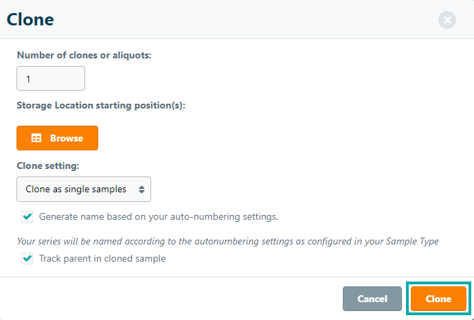 - Generate name based on your auto-numbering settings - applies the auto-numbering setting from existing sample's type to the cloned sample (Note: users must first activate this option in the sample type's Settings page)