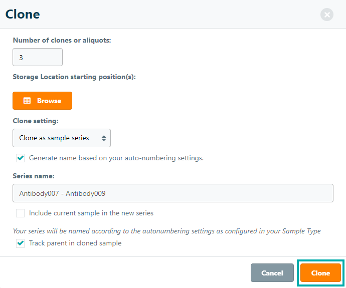 - Include the current sample in series – the sample you are cloning will be included in the created sample series