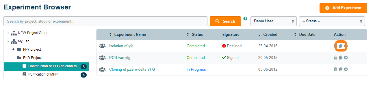 You can create a copy of an experiment in the Experiment Browser or Experiment List. Select the experiment you want to duplicate and click on the Copy icon.
