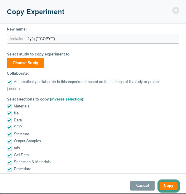 Change the experiment name and choose the study where you want to store the copied experiment. All experiment sections that contain data are copied by default, but you can also specify which sections should be included in the experiment copy. Click Copy to add the experiment copy to your lab notebook.