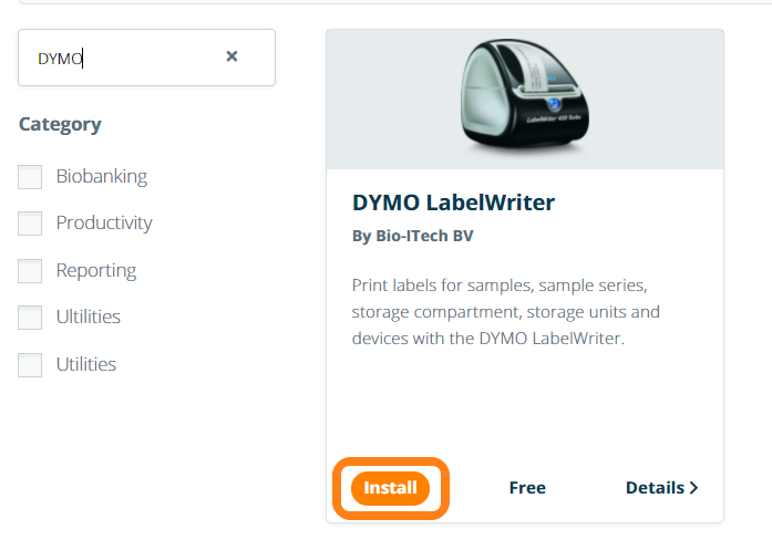 To enable printing of barcode labels with a DYMO LabelWriter© in eLabJournal, install the DYMO LabelWriter add-on from the Marketplace.