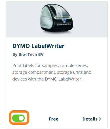 If you successfully printed a label, your printer has been correctly set-up and you can activate the DYMO LabelWriter for your eLabJournal account. Make sure that under installed add-ons in the Marketplace the DYMO LabelWriter add-on is installed and active.
