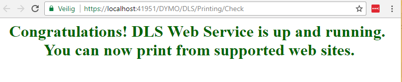 - Your browser will open and confirm that the following message is shown: Congratulations! DLS Web Service is up and running. You can now print from supported web sites: Note that his link will be opened in your default browser which may be a different browser you are using to print labels. Make sure to also open this link in the browser you are working in with eLabJournal by opening this link https://127.0.0.1:41951/DYMO/DLS/Printing/Check