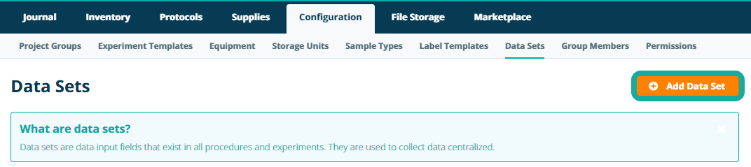 To create a data set, navigate Data Sets under the Configuration tab and click the Add Data Set button.