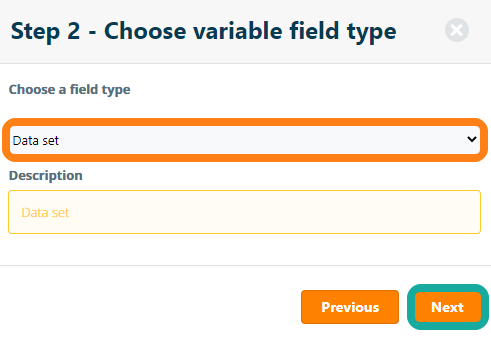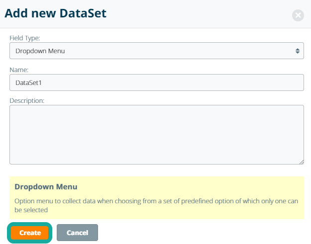In the pop-up window, enter a Field Type, Name and Description for the data set and click the Create button to create the data set. Note: data sets can only be created as "dropdown" field types at this time.