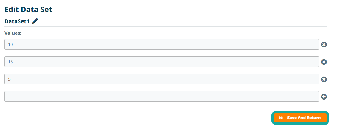 On the data set's details page, each value within the data set is entered as a separate field. To add or remove fields, click the Add or Delete icons inline with the fields. Click Save And Return to commit any changes to the data set.