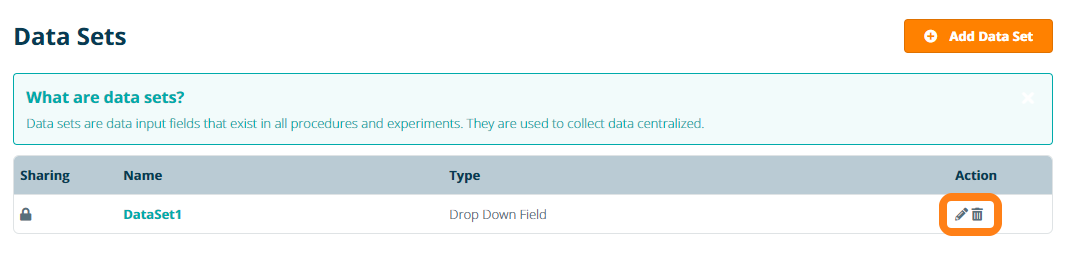 Data sets can be edited or deleted from the Data Sets page by clicking the Edit or Delete icons inline with a given data set. Note: changes made to the values in a data set will automatically be updated in any protocols where the data set has been used.