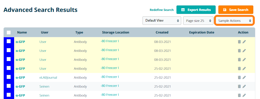 You can also delete multiple sample series at once by selecting the Delete option from the Sample Actions dropdown. This action is present on the sample series information sheet, the Sample List, Inventory Browser and the Advanced Search.