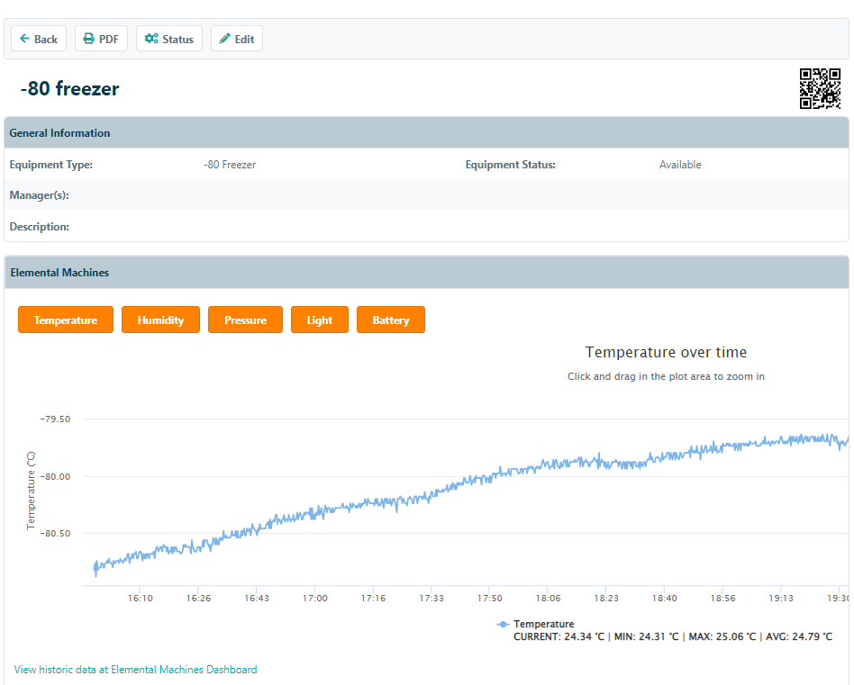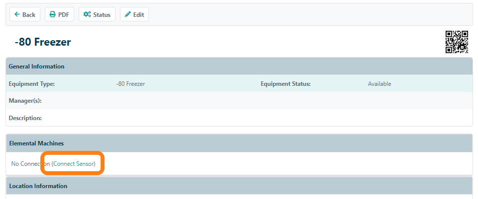 To connect a sensor to your device in eLabJournal, navigate to the storage unit of equipment to view the device. On the device the Elemental Machine section is now available to connect the sensor.