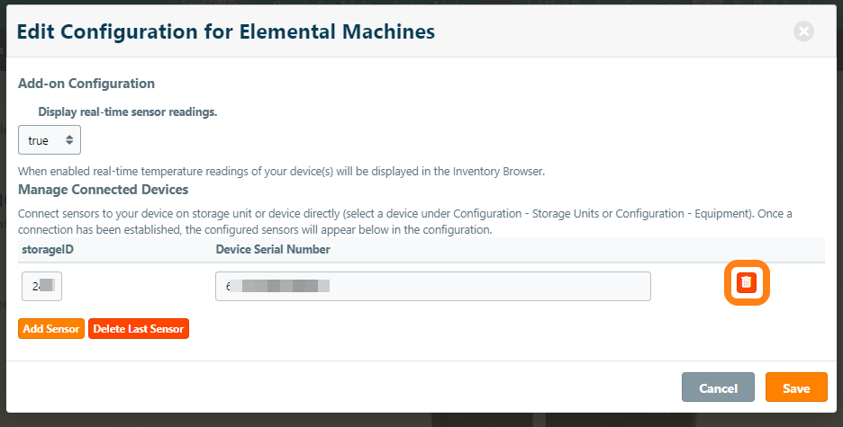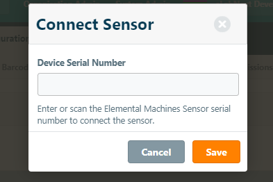 Click Connect Sensor and enter of scan the Elemental Machines sensor serial number and click Save