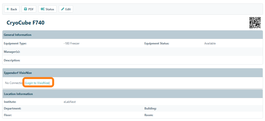 To connect a sensor to your device in eLabJournal, navigate to the storage unit of equipment to view the device. On the device the Eppendorf VisioNize section is listed.