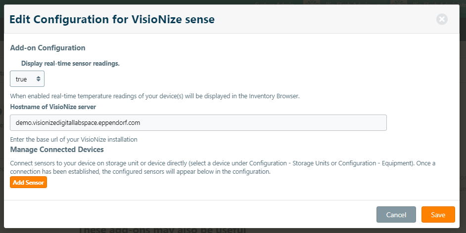 To connect the sensor enter the VisioNze DeviceID (note that currently you can only retrieve the Device ID from the URL in VisioNize when the device sensor data is displayed) and click Save.
