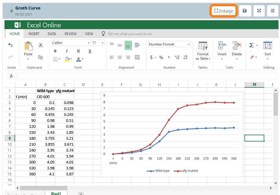 Within the opened the Excel file, you have access to all basic Excel functions, including plotting graphs. You can enlarge the Excel section to view it full screen mode.When saved, an image of the Excel file will automatically be display in the ELN. Please note that the feature to make a preview may not be supported in all web-browsers. Currently, this is supported in Firefox and Chrome.
