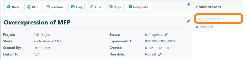To collaborate on experiments with other users, the person you want to work with should be added as a collaborator to your experiment. Open the experiment and select the user from your lab in the dropdown list. Note: users that have the permission to view the experiments of other users can automatically view all experiments of all users and do not need to be explicitly added as a collaborator.