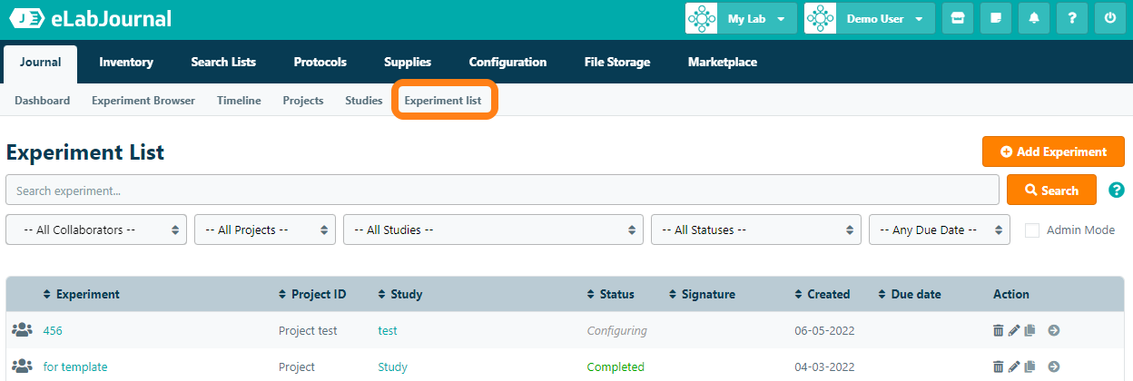 In the Experiment Browser, experiments can be viewed in the tree structure. To see an overview of all the experiments you have created, navigate to the Experiment List. If you change the Collaborators filter to a specific lab member, you can see all of that user's experiments when you are assigned as a collaborator. Additionally, you can filter experiments by Projects, Studies, Status, and Due Date, or you can use the search bar to return results by keyword.