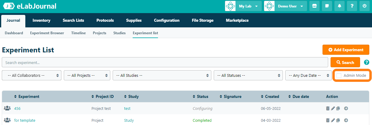 If you have permission to View Others Experiments, you will have an option to check Admin Mode. When Admin Mode is active, you can view all experiments that have been created within the group, regardless of whether you are listed as a collaborator. Note: Admin Mode also applies to the Experiment Browser page when activated.