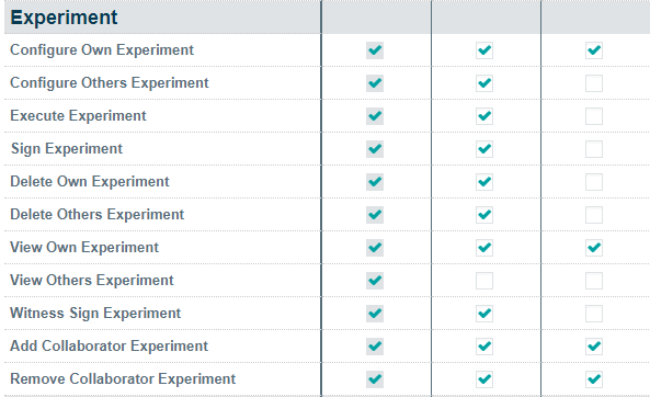 - Configure Own Experiment – required for adding and updating experiments or sections of experiments you created or are assigned to as a collaborator