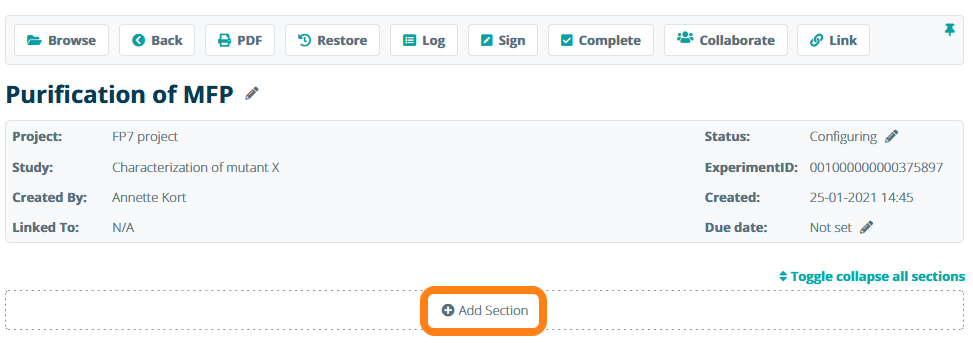 Experiment data in the digital lab notebook is added and stored in Sections. Within an experiment, scroll to the bottom of the page and click Add Section to create a new section.