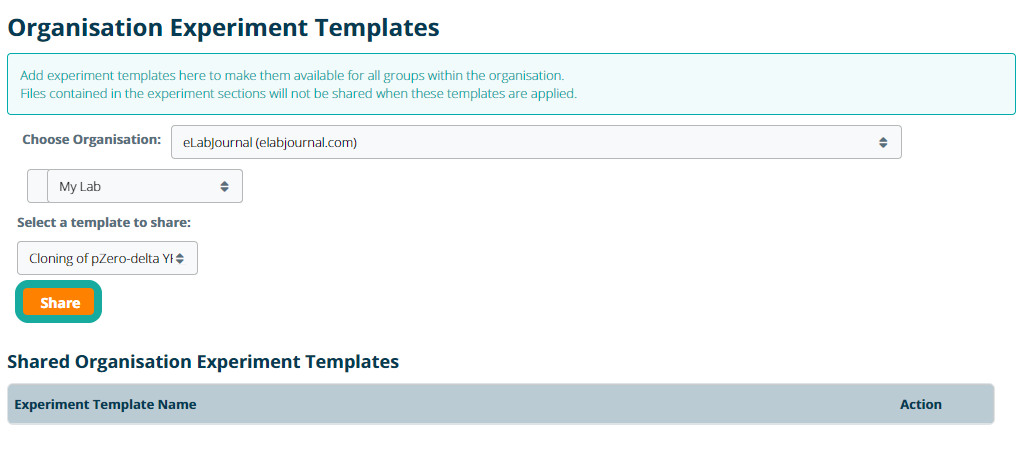 Select the organisation within the system and select the lab from which the sample should be shared. Select the experiment template and click Share to make it available for all labs within the organisation to use.