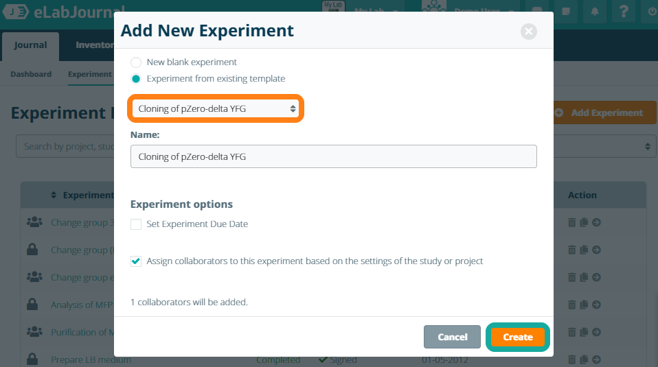 Once the experiment template has been shared, it can be selected from the list when creating an experiment from a template. Click Create to create a new experiment from this template.