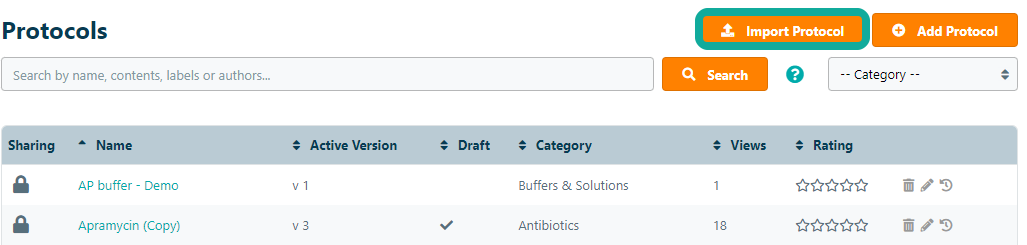 Users can migrate existing protocols or SOPs into the Protocols module using the import feature. Navigate to My Procedures under the Protocols tab and click the Import Protocol button to start the import.