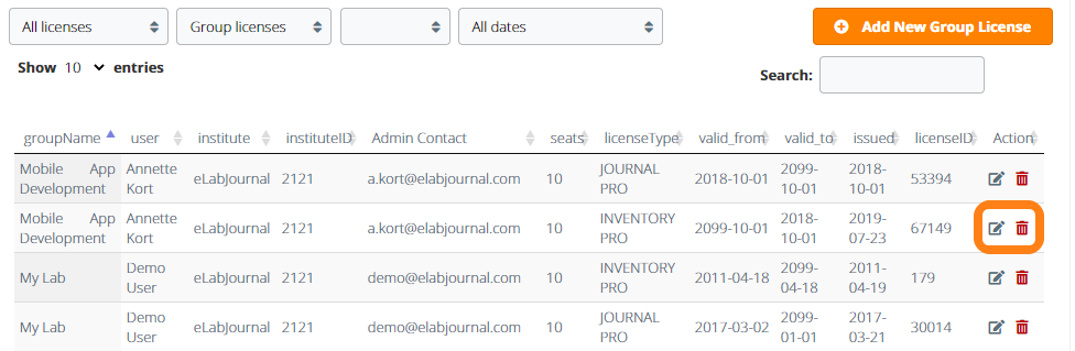 When a group is licensed for the product eLABJournal , both and JOURNAL PRO and an INVENTORY PRO license is issued. When a group is only using eLABInventory, only an INVENTORY PRO license are issued.