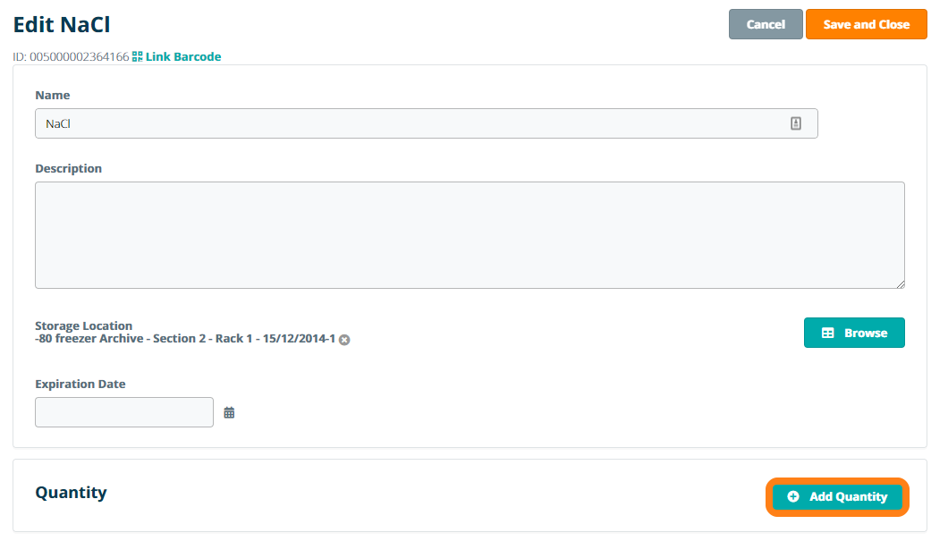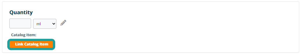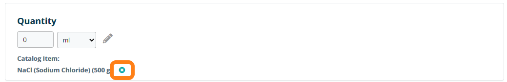 The linked catalog item will be displayed beneath the Quantity field. To unlink the item, clicking the X icon next to the catalog item's name. Note: once an item has been linked, you must still click the Save button on the sample's Edit page to save the linked value.