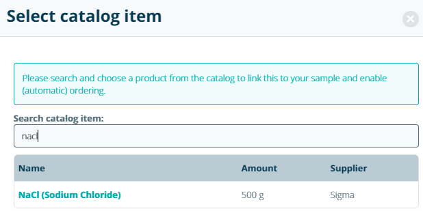 In the pop-up window, users can search the Product Catalog and select an item to link it to the sample. Note: the catalog item must first be added to the product catalog before it can be linked to a sample.